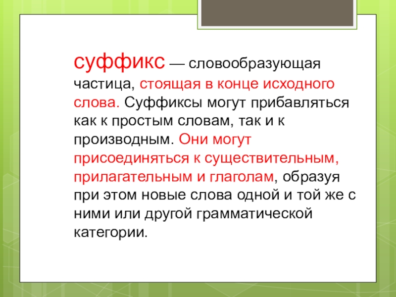 Слайд 7суффикс — словообразующая частица, стоящая в конце исходного слова. Суффиксы могут
