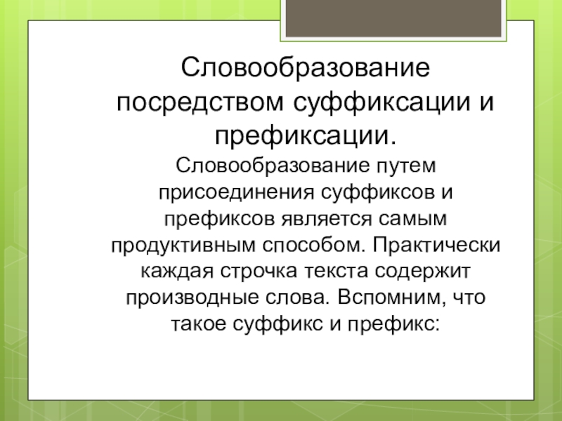 самым продуктивным способом. Практически каждая строчка текста содержит производные слова. Вспомним, что такое суффикс и префикс: