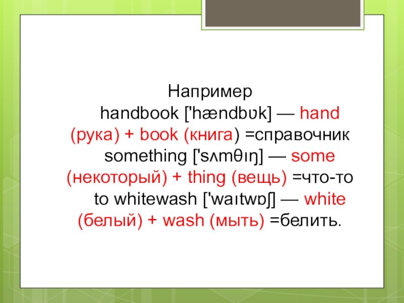 handbook ['hændbʋk] — hand (рука) + book (книга) =справочник