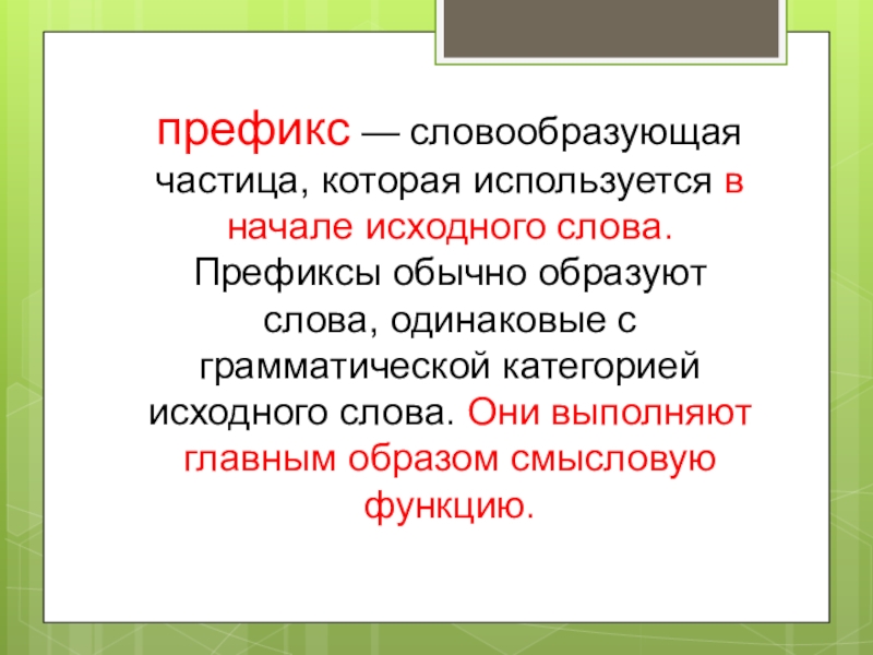Слайд 9префикс — словообразующая частица, которая используется в начале исходного слова. Префиксы