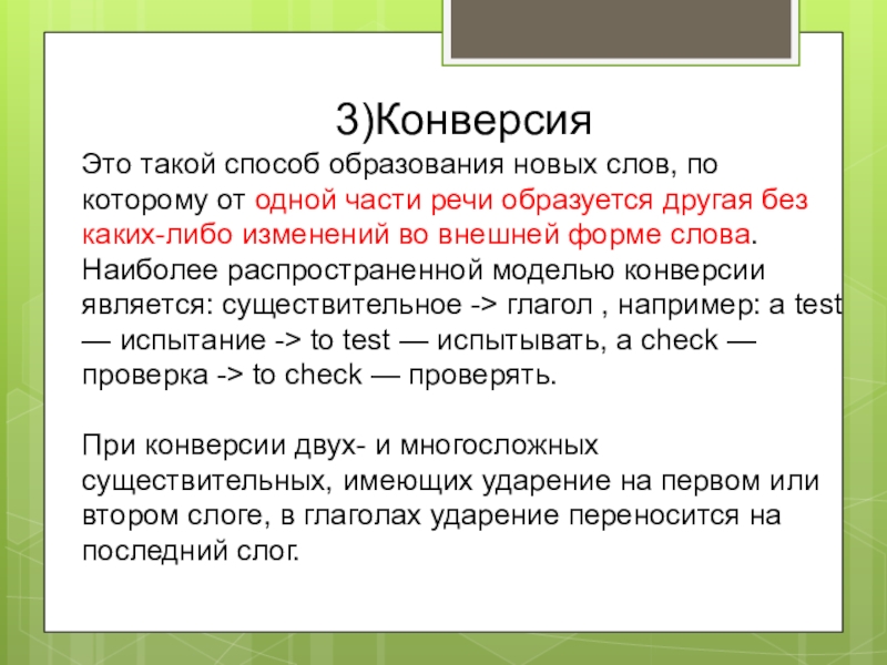 речи образуется другая без каких-либо изменений во внешней форме слова. Наиболее распространенной моделью конверсии является: существительное -> глагол , например: a test — испытание -> to test — испытывать, a check — проверка -> to check — проверять.