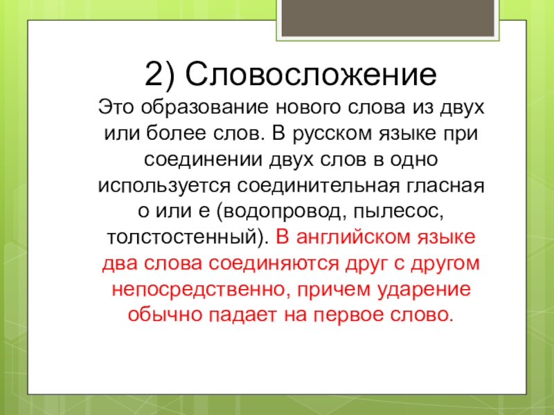 русском языке при соединении двух слов в одно используется соединительная гласная о или е (водопровод, пылесос, толстостенный). В английском языке два слова соединяются друг с другом непосредственно, причем ударение обычно падает на первое слово.
