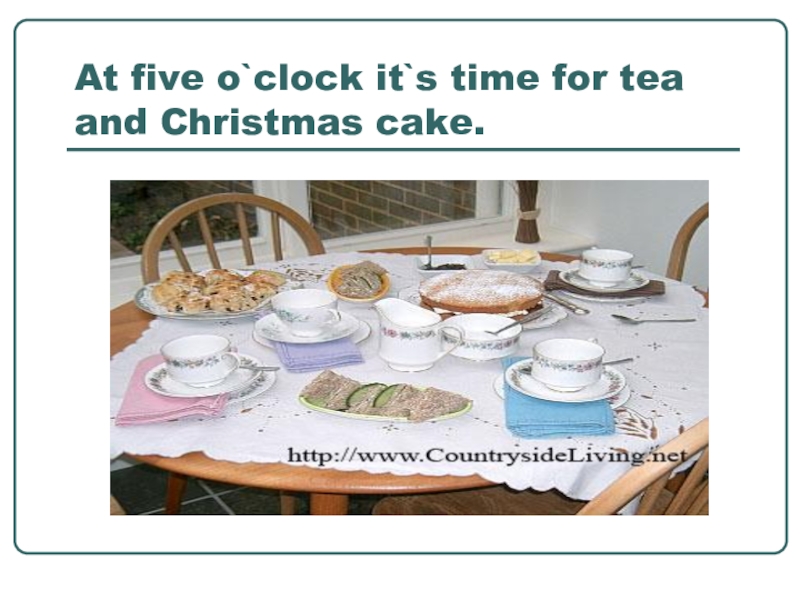Слайд 8At five o`clock it`s time for tea and Christmas cake.