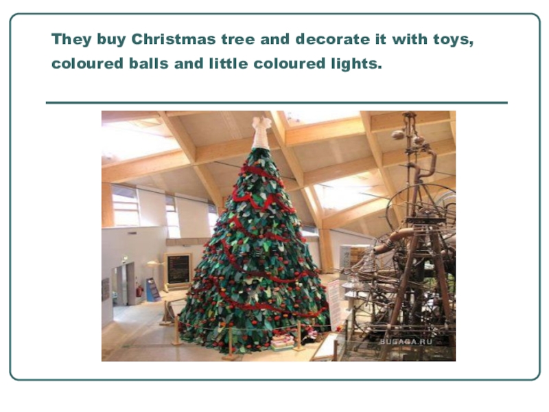 Слайд 6They buy Christmas tree and decorate it with toys, coloured balls