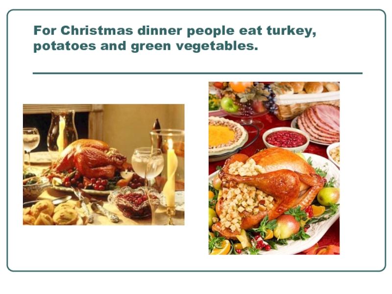 Слайд 7For Christmas dinner people eat turkey, potatoes and green vegetables.