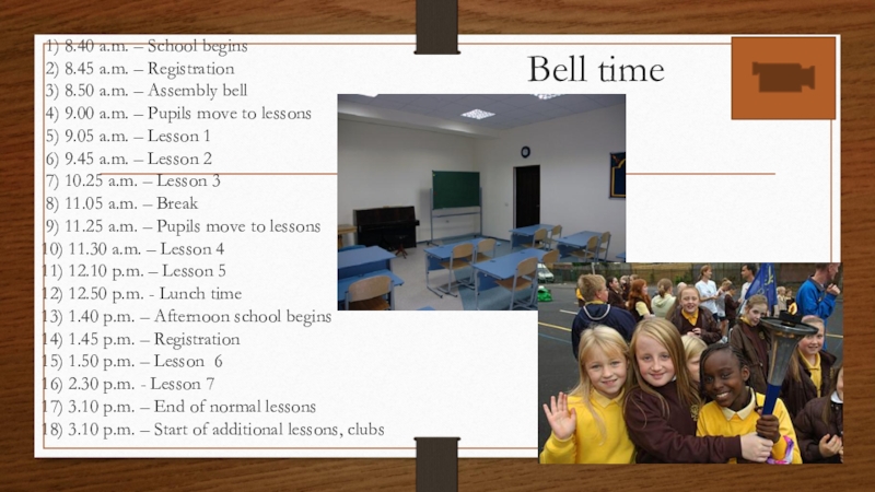 Bell time 1) 8.40 a.m. – School begins 2) 8.45 a.m. – Registration 3) 8.50 a.m. –