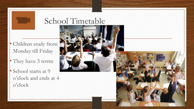 School TimetableChildren study from Monday till FridayThey have 3 termsSchool starts at 9 o’clock and ends at