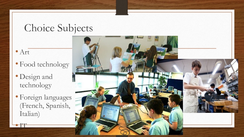 Choice SubjectsArtFood technologyDesign and technologyForeign languages (French, Spanish, Italian)IT