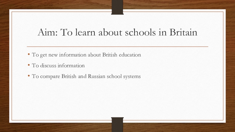 Aim: To learn about schools in BritainTo get new information about British educationTo discuss informationTo compare British and Russian school systems