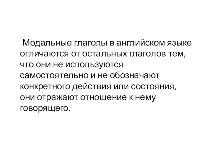 Модальные глаголы в английском языке отличаются от остальных глаголов тем, что они не используются самостоятельно и не обозначают конкретного действия или состояния, они отражают отношение к нему говорящего.
