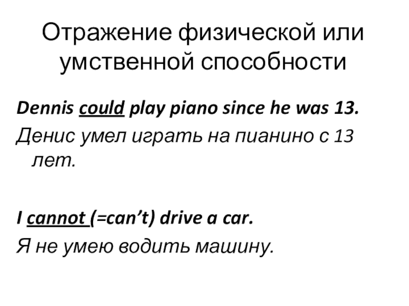 Отражение физической или умственной способностиDennis could play piano since he was 13.Денис умел играть на пианино с