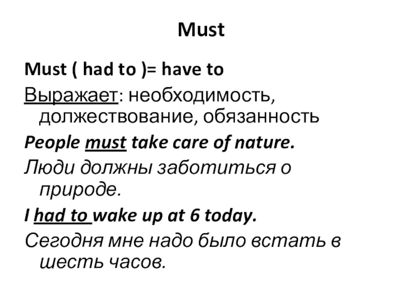 Must Must ( had to )= have toВыражает: необходимость, должествование, обязанностьPeople must take care of nature.Люди должны
