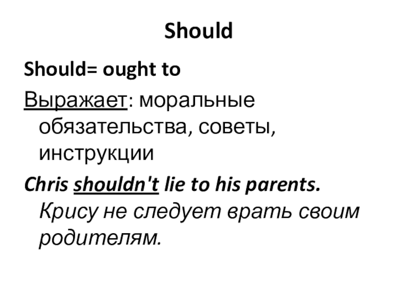 Should Should= ought toВыражает: моральные обязательства, советы, инструкцииChris shouldn't lie to his parents. Крису не следует врать