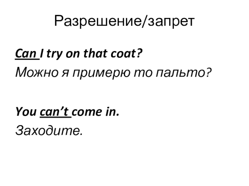 Разрешение/запретCan I try on that coat?Можно я примерю то пальто?You can’t come in.Заходите.