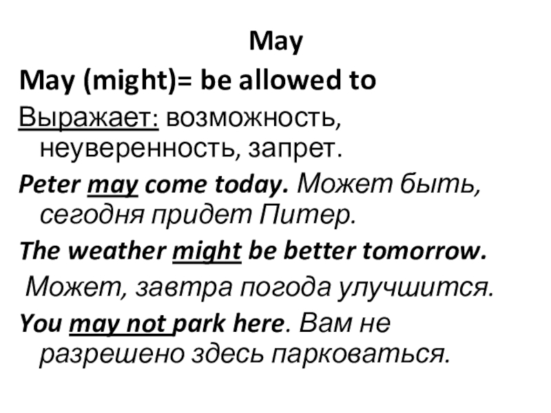 May May (might)= be allowed toВыражает: возможность, неуверенность, запрет.Peter may come today. Может быть, сегодня придет Питер.The