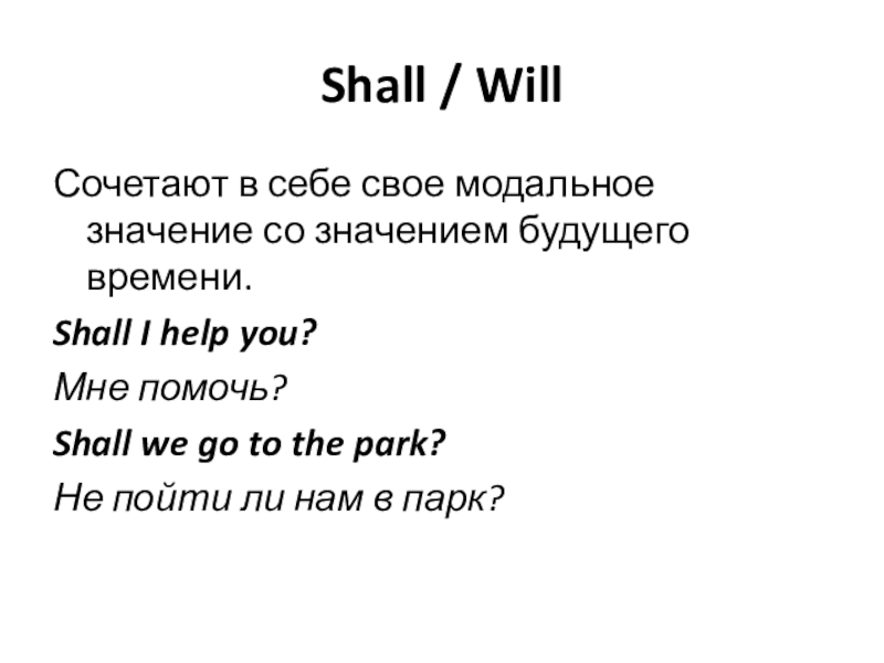 Shall / WillСочетают в себе свое модальное значение со значением будущего времени.Shall I help you? Мне помочь?Shall