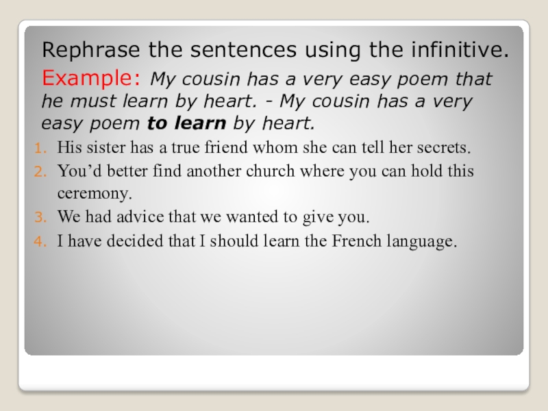 easy poem that he must learn by heart. - My cousin has a very easy poem to learn by heart.