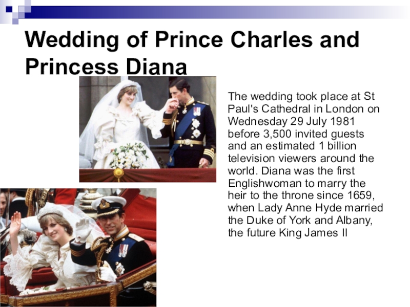 at St Paul's Cathedral in London on Wednesday 29 July 1981 before 3,500 invited guests and an estimated 1 billion television viewers around the world. Diana was the first Englishwoman to marry the heir to the throne since 1659, when Lady Anne Hyde married the Duke of York and Albany, the future King James II