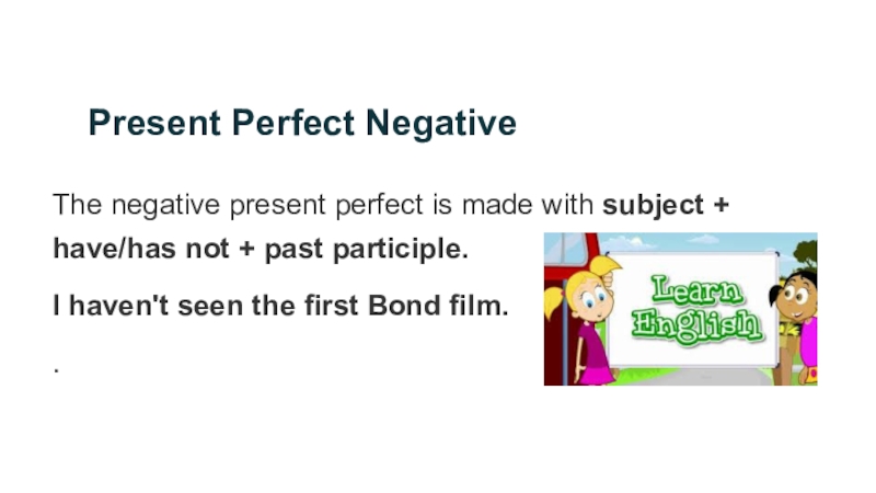 Present Perfect NegativeThe negative present perfect is made with subject + have/has not + past participle.I haven't