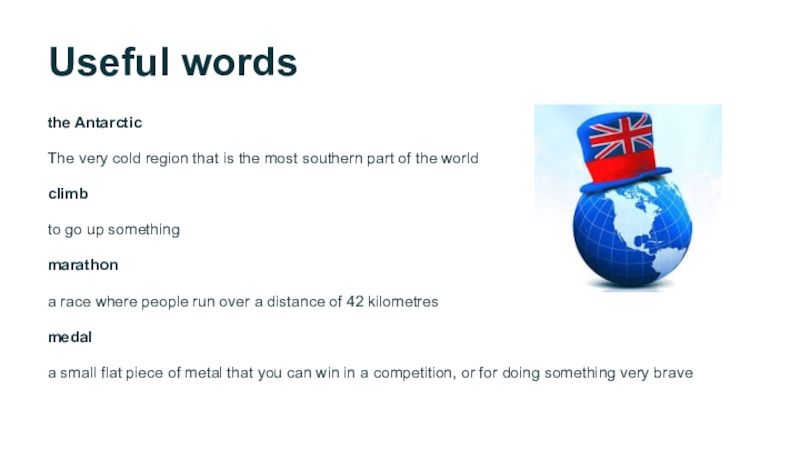 Useful wordsthe AntarcticThe very cold region that is the most southern part of the worldclimbto go up