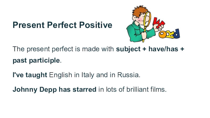 Present Perfect Positive The present perfect is made with subject + have/has + past participle.I've taught English