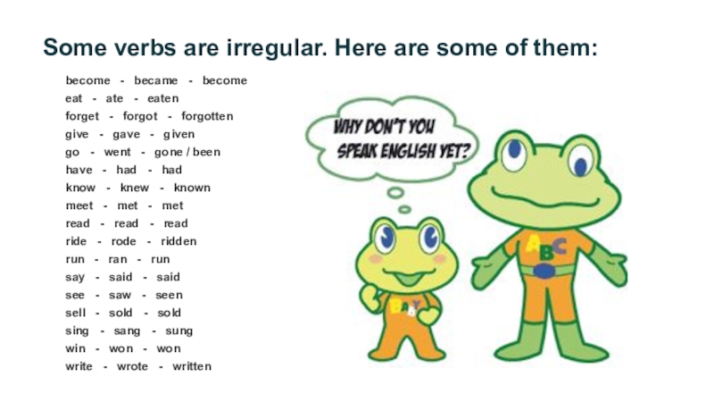 Some verbs are irregular. Here are some of them:become  -  became  -  becomeeat