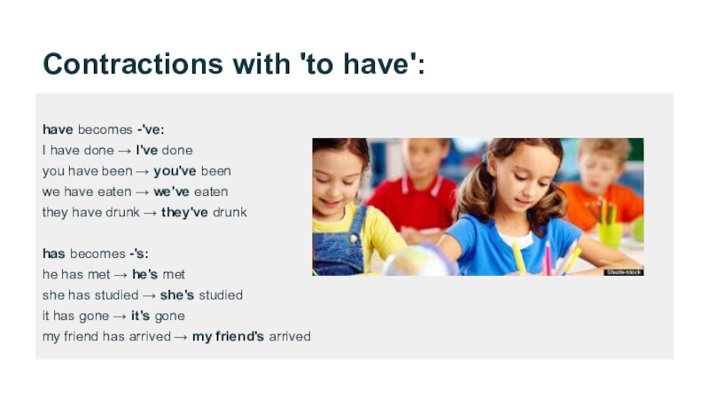 Contractions with 'to have':have becomes -'ve: I have done → I've doneyou have been → you've been