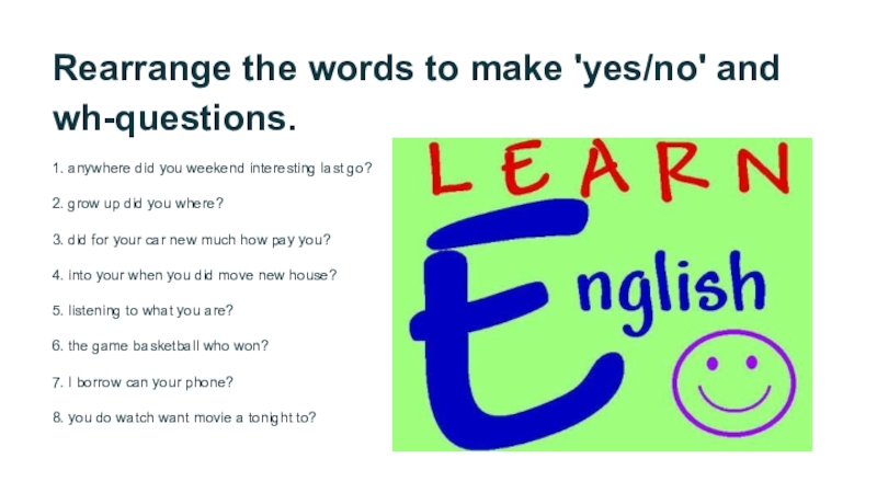 Слайд 3Rearrange the words to make 'yes/no' and wh-questions.