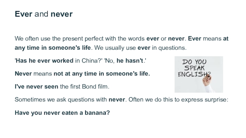 Ever and neverWe often use the present perfect with the words ever or never. Ever means at