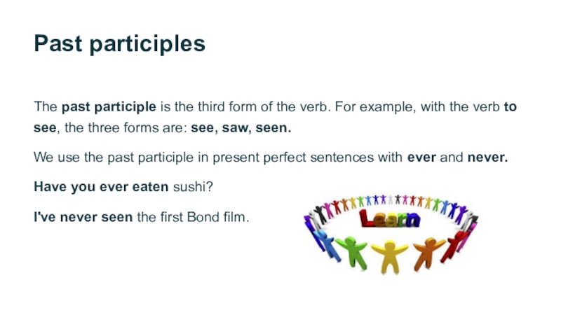 Past participlesThe past participle is the third form of the verb. For example, with the verb to