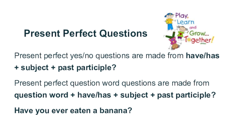 Present Perfect QuestionsPresent perfect yes/no questions are made from have/has + subject + past participle?Present perfect question