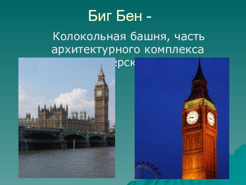 Биг Бен -  Колокольная башня, часть архитектурного комплекса Вестминстерского дворца.
