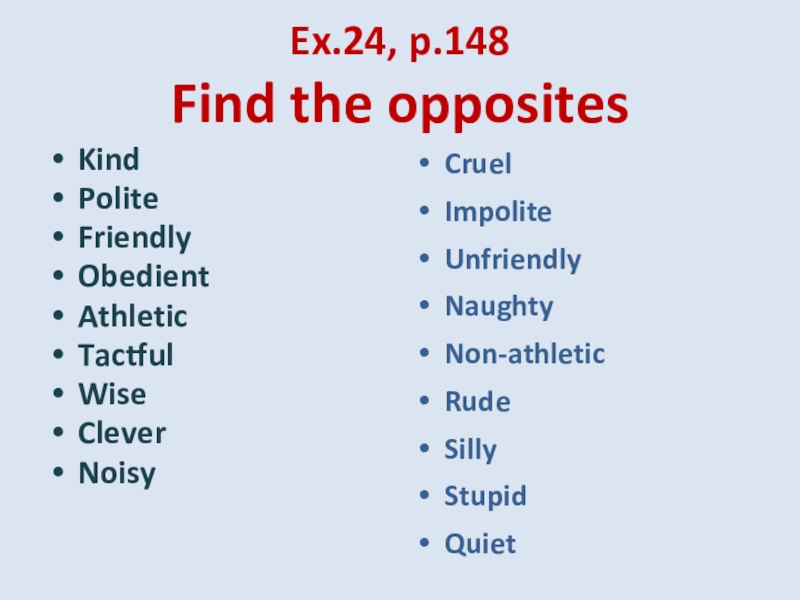 Ex.24, p.148 Find the oppositesKindPoliteFriendlyObedientAthleticTactfulWiseCleverNoisyCruelImpoliteUnfriendlyNaughtyNon-athleticRudeSillyStupidQuiet
