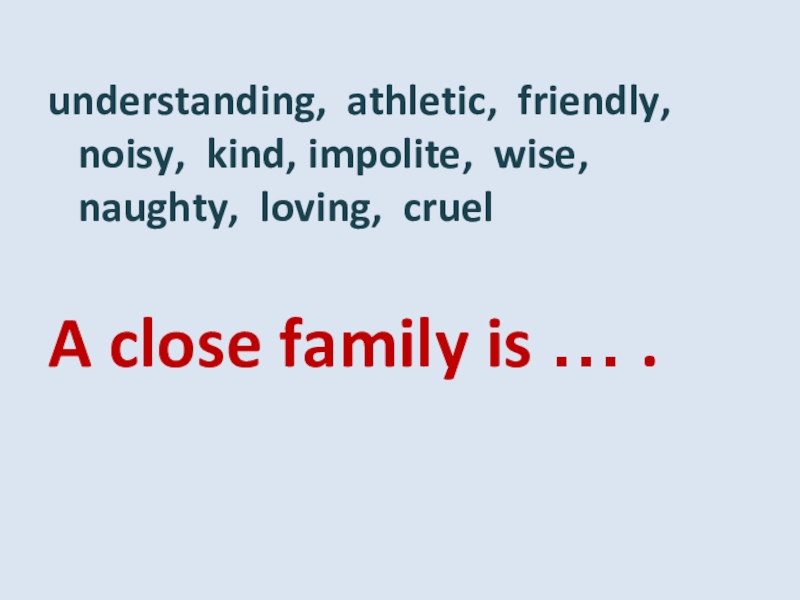 understanding, athletic, friendly, noisy, kind, impolite, wise, naughty, loving, cruelA close family is … .