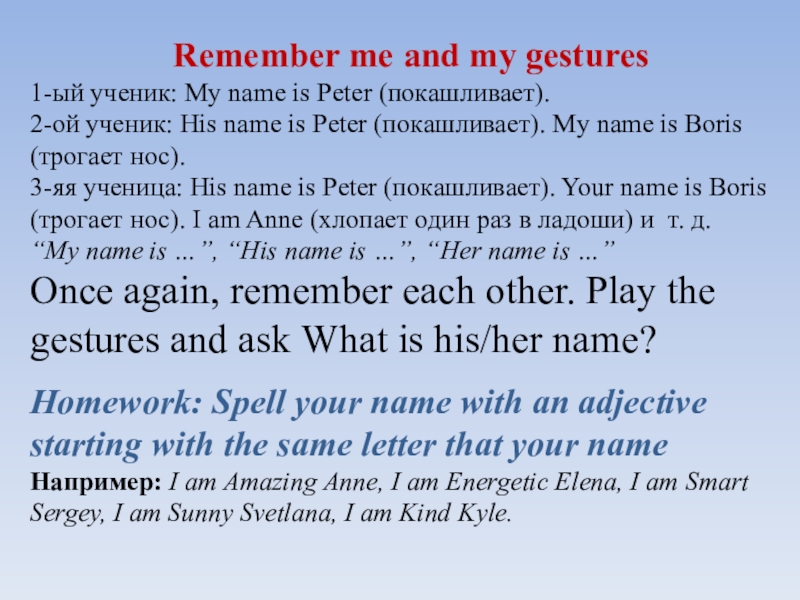 Например: I am Amazing Anne, I am Energetic Elena, I am Smart Sergey, I am Sunny Svetlana, I am Kind Kyle.