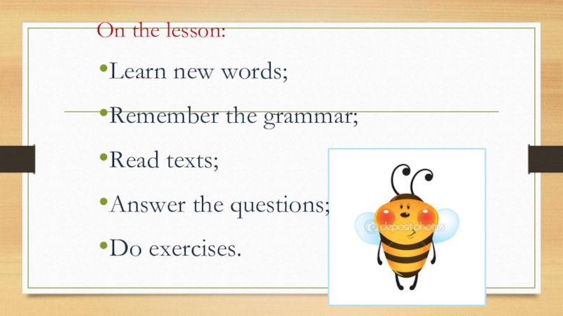 On the lesson:Learn new words;Remember the grammar;Read texts;Answer the questions;Do exercises.