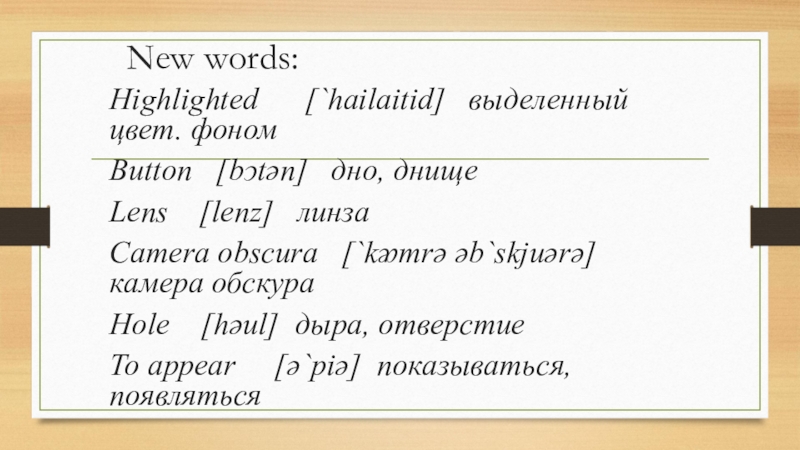 New words:Highlighted   [`hailaitid]  выделенный цвет. фономButton  [bͻtən]  дно, днищеLens  [lenz]