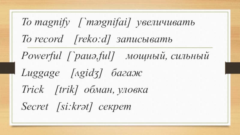 To magnify  [`mᴂgnifai] увеличиватьTo record  [reko:d] записыватьPowerful [`pauə,ful]  мощный, сильныйLuggage  [ʌgidʒ]  багажTrick