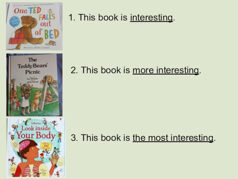 1. This book is interesting.2. This book is more interesting.3. This book is the most interesting.