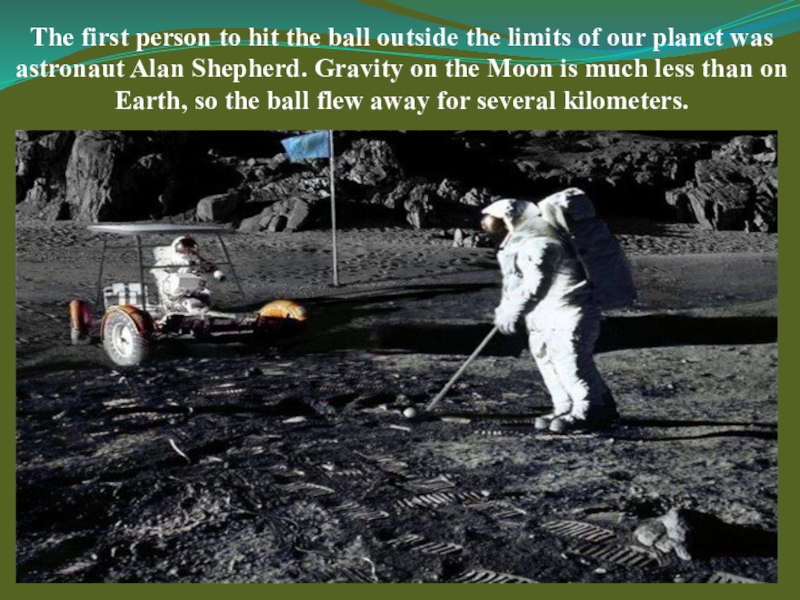 our planet was astronaut Alan Shepherd. Gravity on the Moon is much less than on Earth, so the ball flew away for several kilometers.