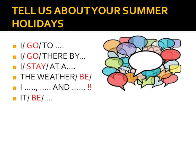 TELL US ABOUT YOUR SUMMER HOLIDAYSI/ GO/ TO ….I/ GO/ THERE BY…I/ STAY/ AT A….THE WEATHER/ BE/….I