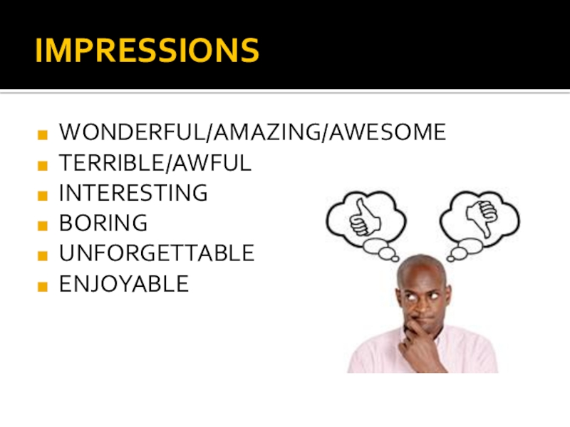 IMPRESSIONSWONDERFUL/AMAZING/AWESOMETERRIBLE/AWFULINTERESTINGBORINGUNFORGETTABLEENJOYABLE