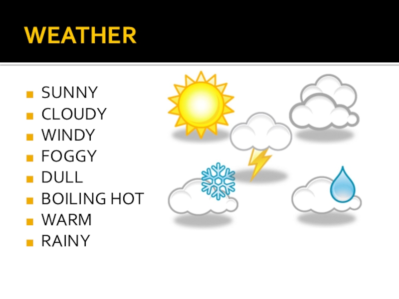 WEATHERSUNNYCLOUDYWINDYFOGGYDULLBOILING HOTWARMRAINY