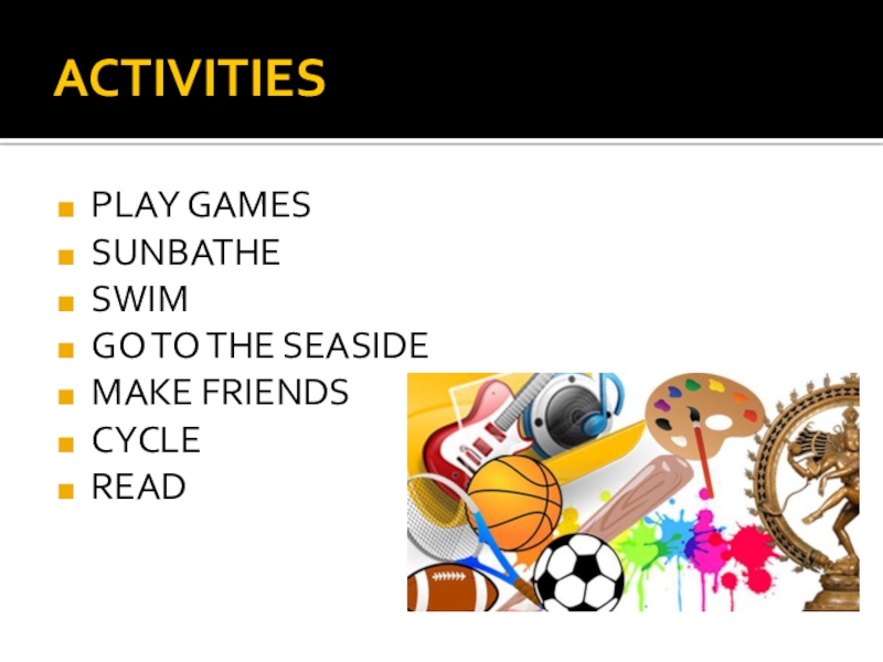 ACTIVITIESPLAY GAMESSUNBATHESWIMGO TO THE SEASIDEMAKE FRIENDSCYCLEREAD