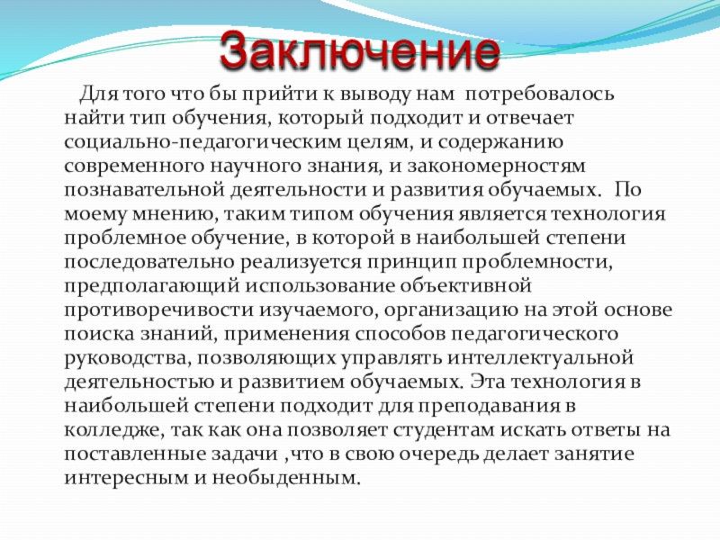 Заключение	Для того что бы прийти к выводу нам потребовалось найти тип обучения, который подходит и отвечает социально-педагогическим