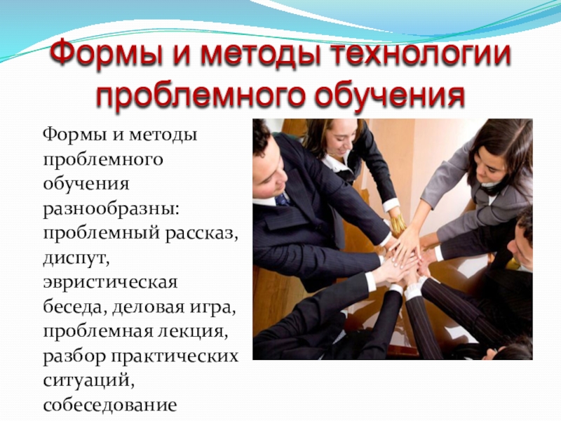 проблемный рассказ, диспут, эвристическая беседа, деловая игра, проблемная лекция, разбор практических ситуаций, собеседование