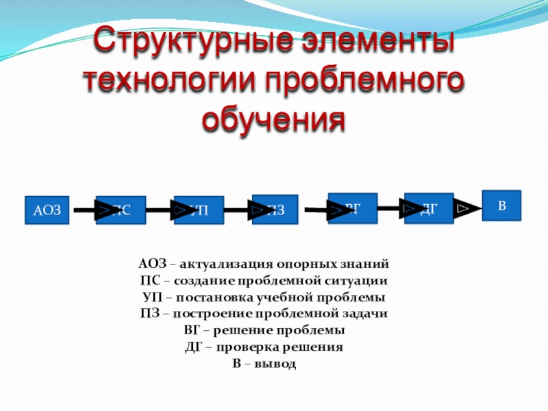 Структурные элементы технологии проблемного обученияАОЗПСУППЗВГДГВАОЗ – актуализация опорных знанийПС – создание проблемной ситуацииУП – постановка учебной проблемыПЗ