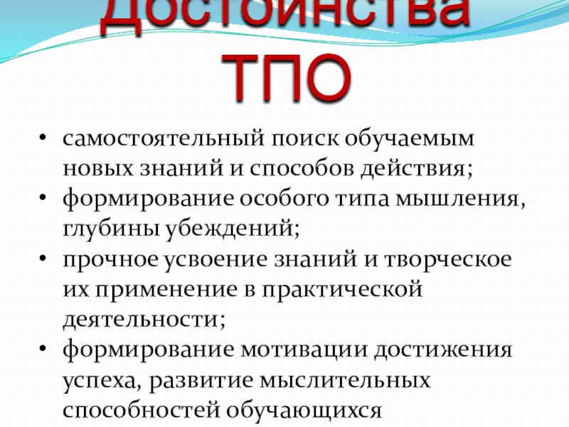 Достоинства ТПОсамостоятельный поиск обучаемым новых знаний и способов действия;формирование особого типа мышления, глубины убеждений;прочное усвоение знаний и