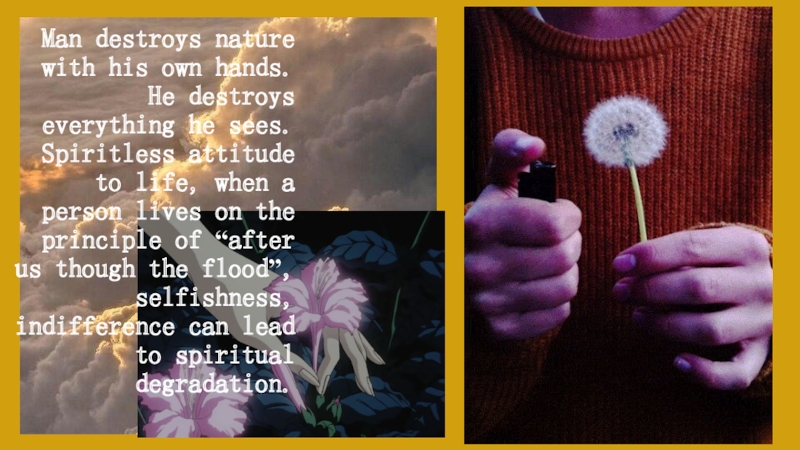 Слайд 7Man destroys nature with his own hands. He destroys everything he