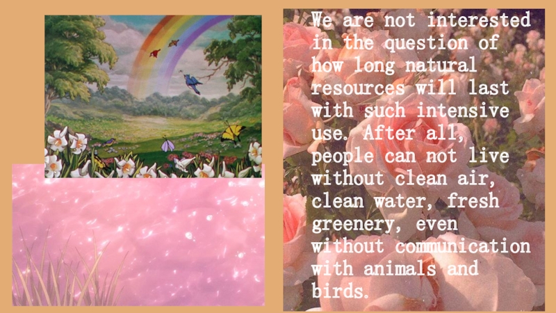 resources will last with such intensive use. After all, people can not live without clean air, clean water, fresh greenery, even without communication with animals and birds.